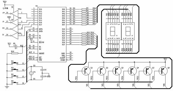要求:控制电路如图3所示,开机后,电机不转,按下启动键,电机旋转,速度为25转/分,按下加1键,速度增加,按下减1键,速度降低,最高速度为100转/分,最低转带为25转/分,按下停止键,电机停转。速度值要求在数码管上显示出来。