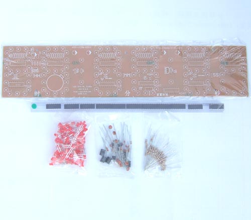 本电子钟为纯硬件电路,非常适合数字电路实践制作,是各学校、院校的电子实习首先套件!本电子钟走时由石英晶振决定,走时精度高,主要元件有11个集成电路、130个高亮发光二极管和53个电阻及其它所有元件用胶袋包成一包,配上330MM*70MM大尺寸的电路板,欢迎各位电子爱好者一起动手制作。