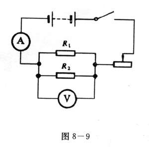 实验按图8-9连接电路,R1、R2、是两个已知阻值的电阻,合上开关,测出并联电路两端的电压和干路中的电流,用欧姆定律算出R1与R2并联后的总电阻,并将这个阻值与R1、R2进行比较.
